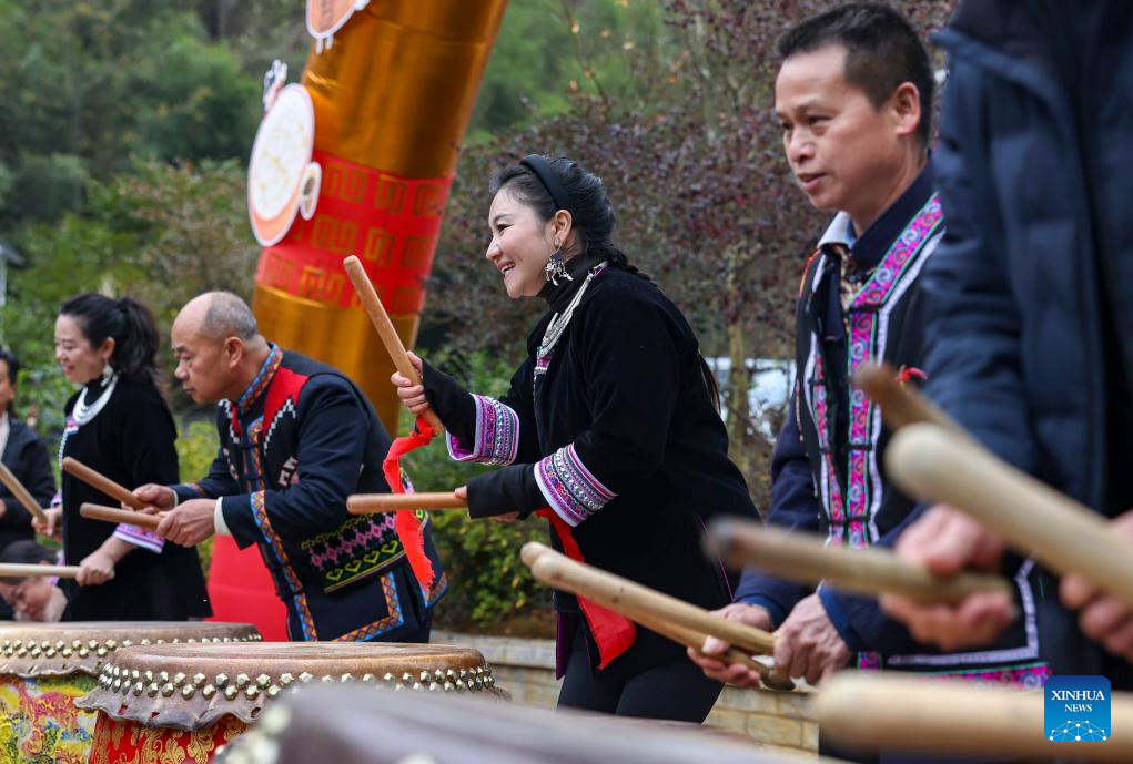 This photo taken on Dec. 21, 2025 shows villagers beating drums to celebrate the Winter Solstice in Dawan Village, Tongren City of southwest China's Guizhou Province.