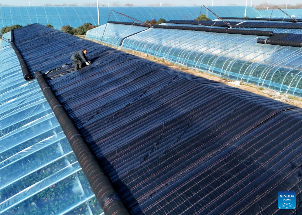 A drone photo taken on Jan. 7, 2026 shows a worker covering greenhouses with films to keep them warm at a vegetable planting base in Lidian Town, Nanyang City of central China's Henan Province.