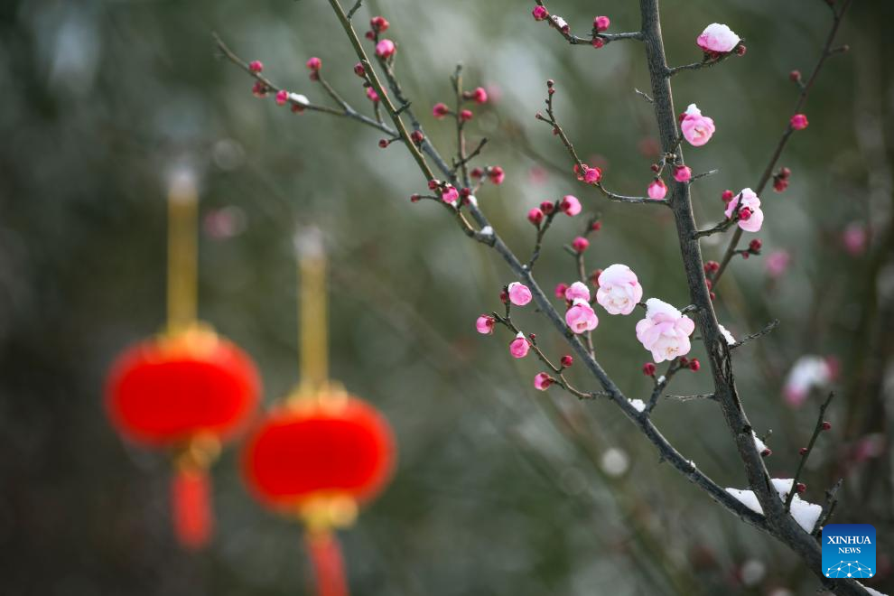 This photo taken on Jan. 1, 2026 shows plum flowers after a snowfall at a plum garden in Huashi Village, Jiyuan City of central China's Henan Province.