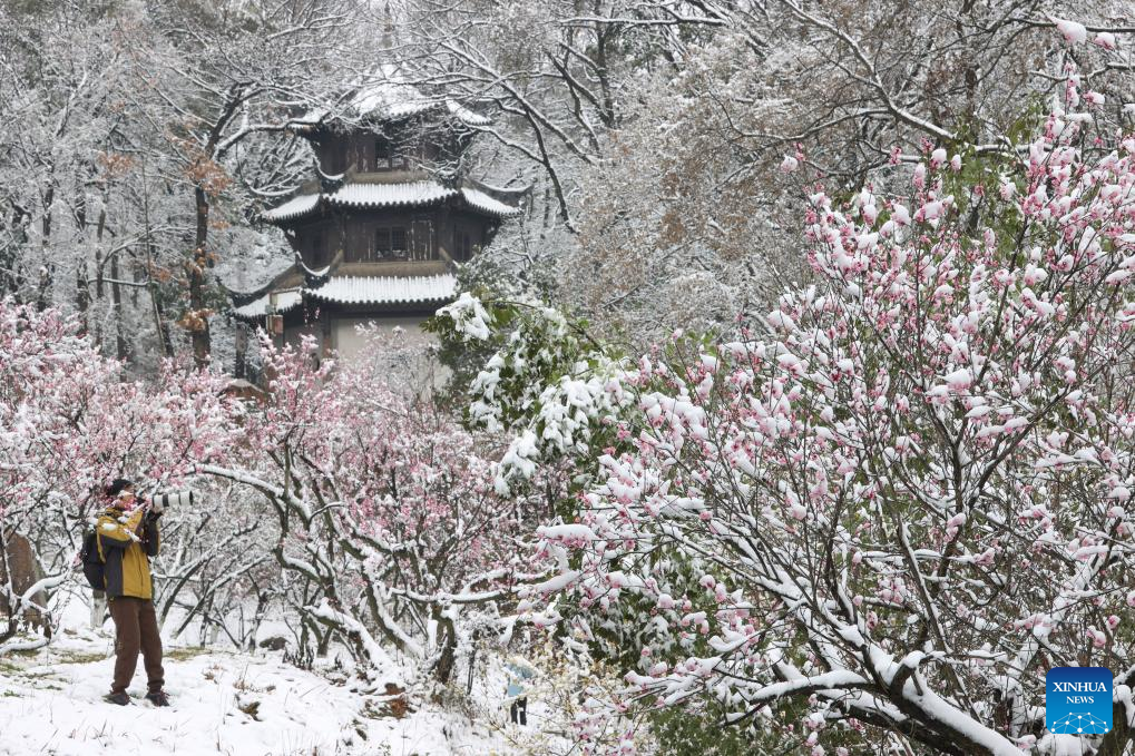 This photo taken on Jan. 1, 2026 shows a visitor taking photos of plum flowers after snowfall at Gulongzhong scenic spot in Xiangyang, central China's Hubei Province.