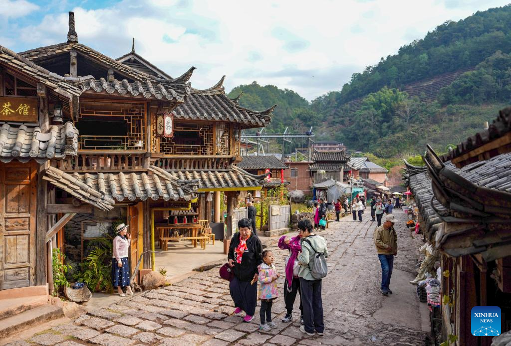 Tourists visit Nakeli Village, in Hani and Yi Autonomous County of Ning'er, Pu'er City, southwest China's Yunnan Province on Jan. 14, 2026. The village of Nakeli, previously witnessed boisterous camel caravans carrying sacks of tea leaves while winding through ancient China's vast western area all the way to Southeast Asia and the Middle East. Today, the village has become a popular winter travel destination for tourists, thanks to its unique Tea Horse Road culture and pleasant climate. Besides visiting historical sites, tourists can also immerse themselves in activities such as making Pu'er tea products, retracing ancient paths on horseback, and tasting intangible cultural heritage cuisine. (Xinhua/Chen Xinbo)
