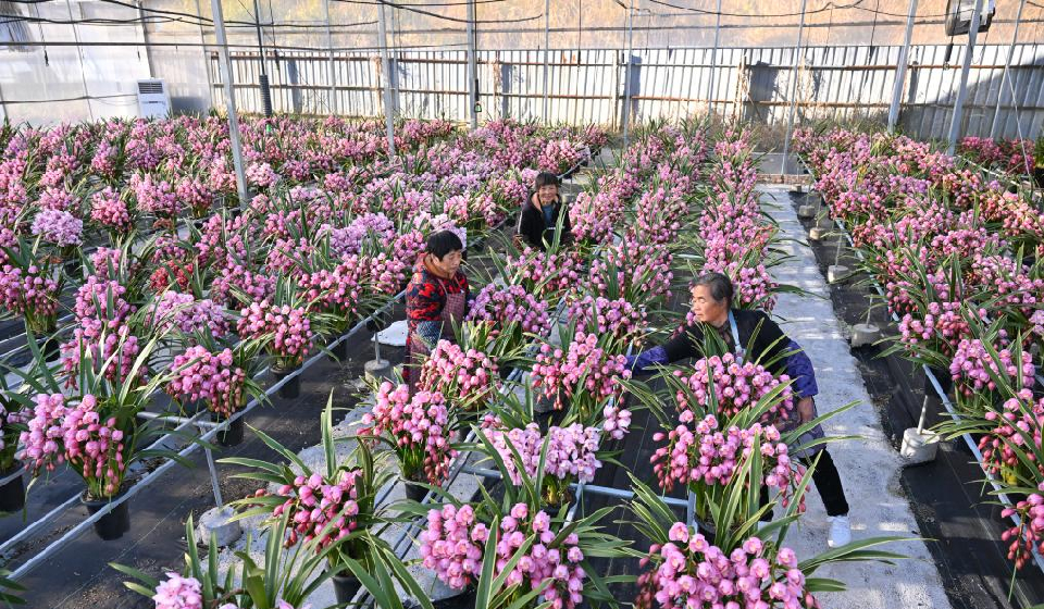 Staff members work at a cymbidium hybrid orchid greenhouse in Puyuan Township of Zhouning County, southeast China's Fujian Province, Jan. 14, 2026. With the approach of the Spring Festival, the market for high-altitude, cold-tolerant flowers has been steadily heating up. Inside the greenhouses of various flower enterprises, flowers in Zhouning County are blooming in full swing. Workers are busy with picking, pruning, shaping, and packaging to ensure sufficient market supply during the holiday season.