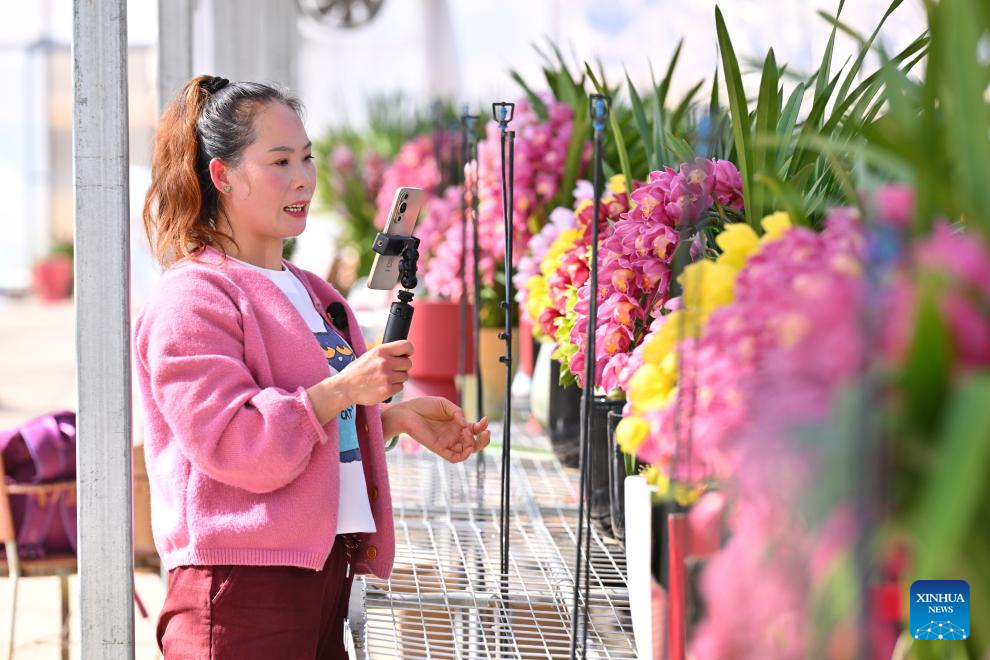 A staff member introduces cymbidium hybrid orchid potted plants via livestream at a greenhouse in Qibu Township of Zhouning County, southeast China's Fujian Province, Jan. 15, 2026. With the approach of the Spring Festival, the market for high-altitude, cold-tolerant flowers has been steadily heating up. Inside the greenhouses of various flower enterprises, flowers in Zhouning County are blooming in full swing. Workers are busy with picking, pruning, shaping, and packaging to ensure sufficient market supply during the holiday season.