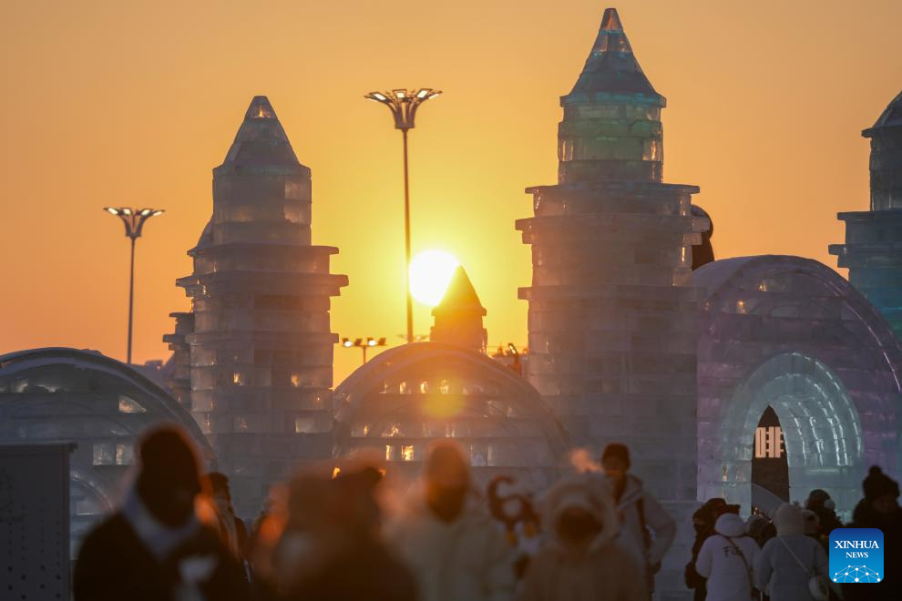 Tourists have fun at sunset at the Harbin Ice-Snow World, the world's largest ice-and-snow theme park, in Harbin, northeast China's Heilongjiang Province, Jan. 18, 2026. (Xinhua/Wang Jianwei)