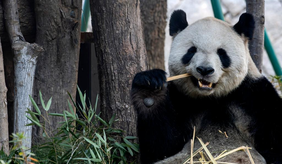 Giant panda Ailun enjoys bamboo at the Panda World in Fuzhou, southeast China's Fujian Province on Jan. 17, 2026. Five giant pandas, arriving from Chengdu, met the public at the reopened Fuzhou Panda World on Saturday, following a 20-day adaptation period. (Xinhua/Wei Peiquan)