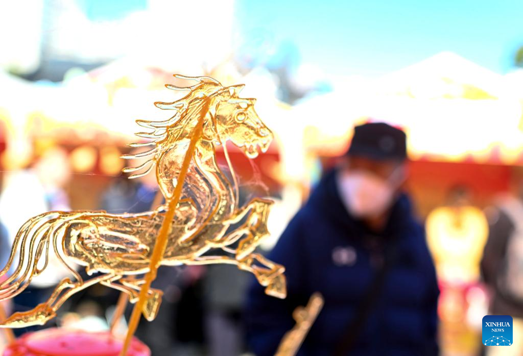 This photo taken on Jan. 23, 2026 shows a horse-shaped syrup craft displayed during a fair for New Year supplies at a park in Nanjing City, east China's Jiangsu Province. Chinese people are busy preparing fresh flowers, Chinese knots, spring couplets, and other traditional necessities to celebrate the upcoming Spring Festival, or the Chinese New Year. (Photo by Yang Suping/Xinhua)