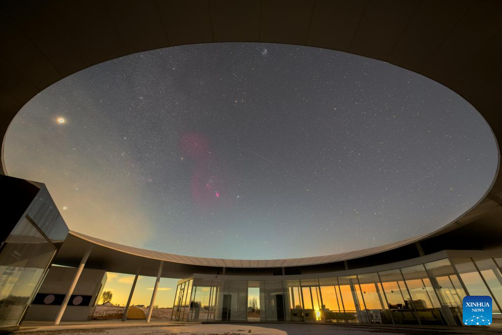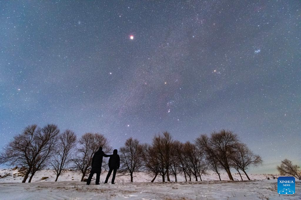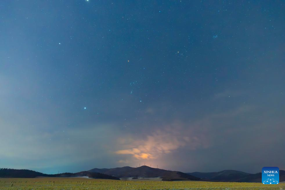 This photo taken on Jan. 18, 2026 shows a view of the planet of Jupiter and the Orion in Jiamusi City, northeast China's Heilongjiang Province. China's northernmost Heilongjiang Province has entered the golden period for winter starry sky observation. With auroras occasionally making an appearance, the brilliant starry sky and the icy landscape together unfold a serene and breathtaking picture. (Photo by Zhu Zongqiang/Xinhua)