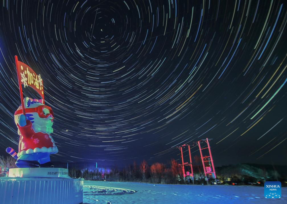 This stack composite photo taken on Jan. 18, 2026 shows a view of the starry sky at Yabuli Ski Resort in northeast China's Heilongjiang Province. China's northernmost Heilongjiang Province has entered the golden period for winter starry sky observation. With auroras occasionally making an appearance, the brilliant starry sky and the icy landscape together unfold a serene and breathtaking picture. (Photo by Zeng Dong/Xinhua)