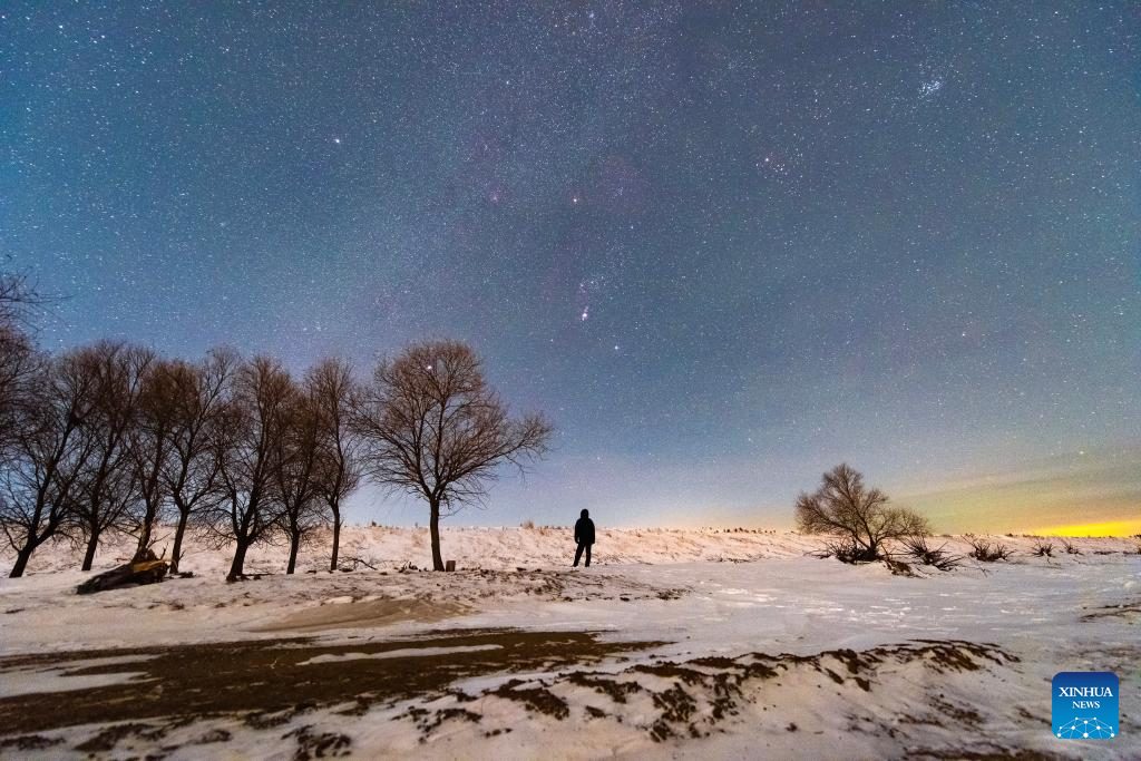 This stack composite photo taken on Jan. 23, 2026 shows a view of the Orion in the Mongolian Autonomous County of Dorbod, Daqing City, northeast China's Heilongjiang Province. China's northernmost Heilongjiang Province has entered the golden period for winter starry sky observation. With auroras occasionally making an appearance, the brilliant starry sky and the icy landscape together unfold a serene and breathtaking picture. (Photo by Liu Wei/Xinhua)