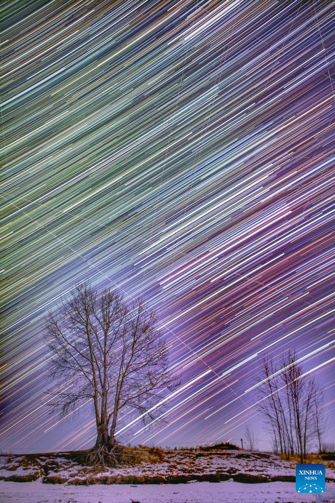 This stack composite photo taken on Jan. 27, 2026 shows a view of the starry sky in Yichun City, northeast China's Heilongjiang Province. China's northernmost Heilongjiang Province has entered the golden period for winter starry sky observation. With auroras occasionally making an appearance, the brilliant starry sky and the icy landscape together unfold a serene and breathtaking picture. (Photo by Li Jiaxing/Xinhua)