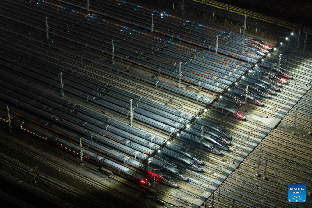 Maintenance workers inspect train carriages at a maintenance depot in Tianjin, north China, Feb. 2, 2026.