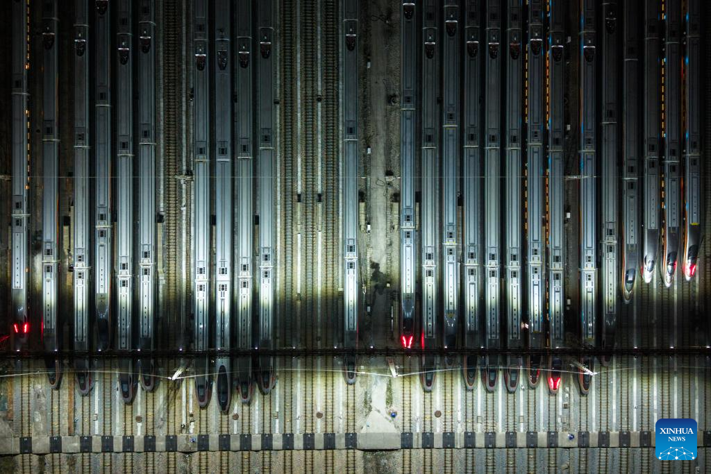 An aerial drone photo taken on Feb. 2, 2026 shows high-speed trains at a maintenance depot in Changsha, central China's Hunan Province.