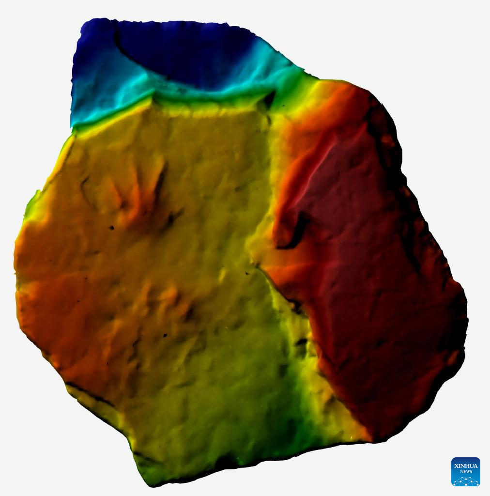 This photo taken on July 30, 2025 shows a 3D digital model of amphibian track fossils in Middle Jurassic strata discovered in Beijing, capital of China. (China University of Geosciences (Beijing)/Handout via Xinhua)