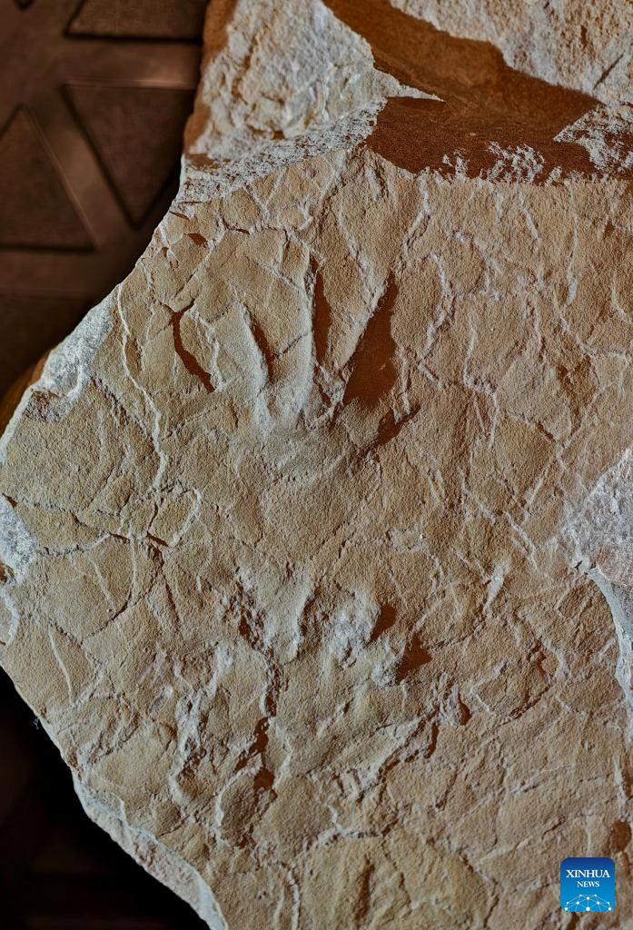 Amphibian track fossils in Middle Jurassic strata, preserved on a single slab, are pictured in Beijing, capital of China, July 27, 2025. (China University of Geosciences (Beijing)/Handout via Xinhua)