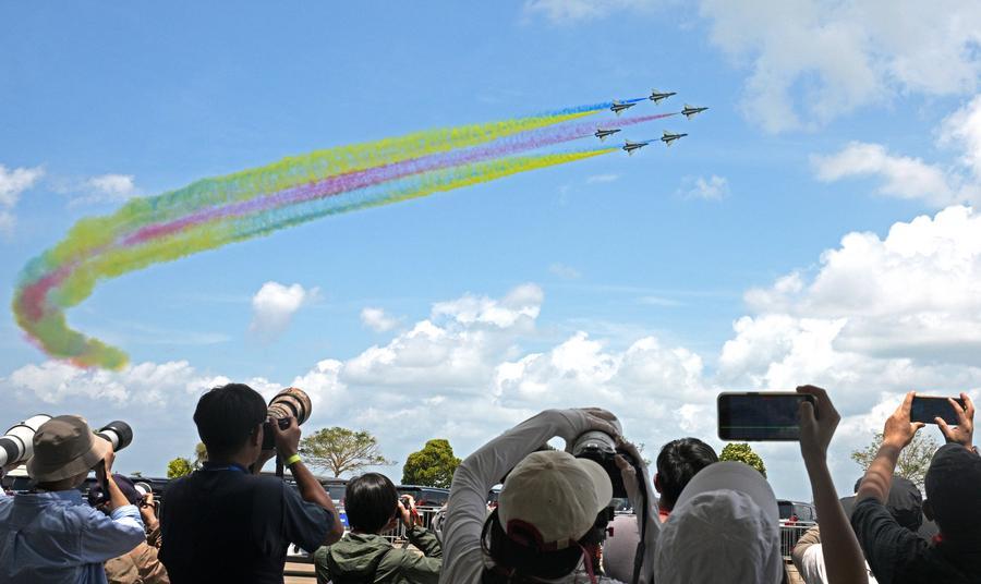SINGAPORE, Feb. 4 (Xinhua) -- The 10th Singapore Airshow opened on Tuesday at the Changi Exhibition Center, with the Bayi Aerobatic Team of the Chinese PLA Air Force delivering a flight display featuring six J-10 fighter jets.