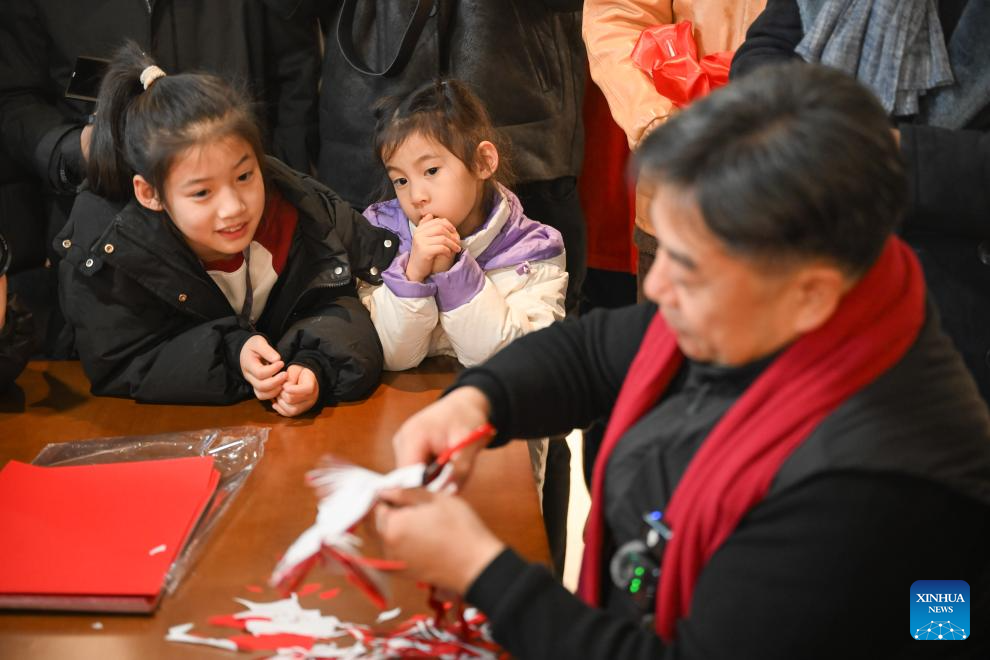 Two children watch a craftsman making a piece of Horinger paper-cutting work at an exhibition hall of the Horinger Tuchengzi Archaeological Site Park in Horinger County, north China's Inner Mongolia Autonomous Region, Feb. 4, 2026. Events featuring the traditional craft of Horinger paper-cutting, a national intangible cultural heritage, were held in Horinger County on Wednesday to mark "Lichun," or the Beginning of Spring, the first of the 24 solar terms on the Chinese lunar calendar, and to welcome the upcoming Spring Festival. (Xinhua/Bei He)