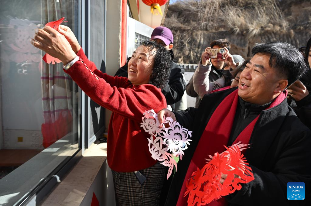 Duan Jianjun (front R), a national representative inheritor of Horinger paper-cutting, pastes paper-cutting works on a window with villagers in Taigedou Village of Horinger County, north China's Inner Mongolia Autonomous Region, Feb. 4, 2026. Events featuring the traditional craft of Horinger paper-cutting, a national intangible cultural heritage, were held in Horinger County on Wednesday to mark "Lichun," or the Beginning of Spring, the first of the 24 solar terms on the Chinese lunar calendar, and to welcome the upcoming Spring Festival. (Xinhua/Bei He)
