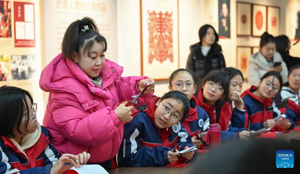 Students learn Horinger paper-cutting skills at an exhibition hall of the Horinger Tuchengzi Archaeological Site Park in Horinger County, north China's Inner Mongolia Autonomous Region, Feb. 4, 2026. Events featuring the traditional craft of Horinger paper-cutting, a national intangible cultural heritage, were held in Horinger County on Wednesday to mark "Lichun," or the Beginning of Spring, the first of the 24 solar terms on the Chinese lunar calendar, and to welcome the upcoming Spring Festival. (Xinhua/Bei He)