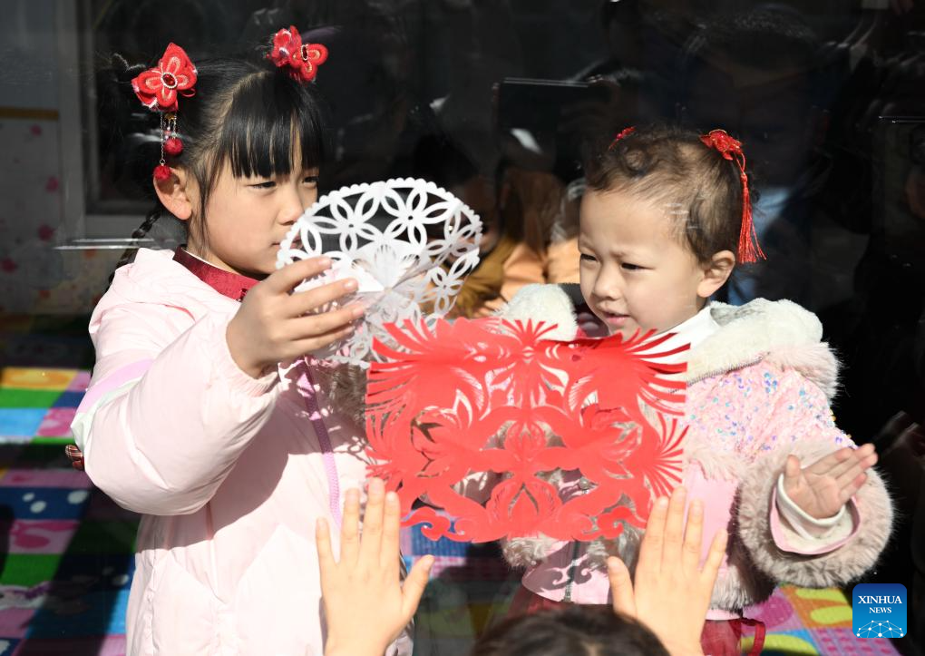 Two children paste paper-cutting works on a window in Taigedou Village of Horinger County, north China's Inner Mongolia Autonomous Region, Feb. 4, 2026. Events featuring the traditional craft of Horinger paper-cutting, a national intangible cultural heritage, were held in Horinger County on Wednesday to mark "Lichun," or the Beginning of Spring, the first of the 24 solar terms on the Chinese lunar calendar, and to welcome the upcoming Spring Festival. (Xinhua/Bei He)