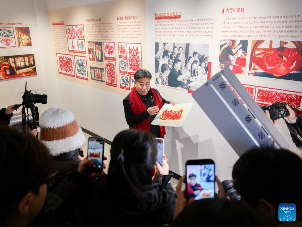 Duan Jianjun, a national representative inheritor of Horinger paper-cutting, introduces a piece of paper-cutting work at an exhibition hall of the Horinger Tuchengzi Archaeological Site Park in Horinger County, north China's Inner Mongolia Autonomous Region, Feb. 4, 2026. Events featuring the traditional craft of Horinger paper-cutting, a national intangible cultural heritage, were held in Horinger County on Wednesday to mark "Lichun," or the Beginning of Spring, the first of the 24 solar terms on the Chinese lunar calendar, and to welcome the upcoming Spring Festival. (Xinhua/Ma Jinrui)