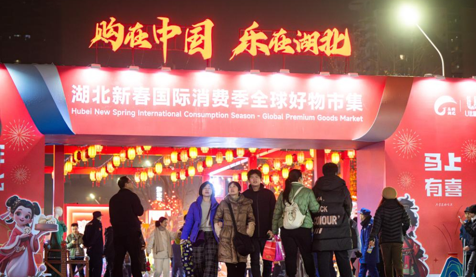 Consumers visit an event themed on the "Hubei New Spring International Consumption Season" in Wuhan, central China's Hubei Province, Feb. 5, 2026. The "Hubei New Spring International Consumption Season" kicked off here on Thursday, attempting to create diverse consumption scenarios for the upcoming Spring Festival. (Xinhua/Xiao Yijiu)