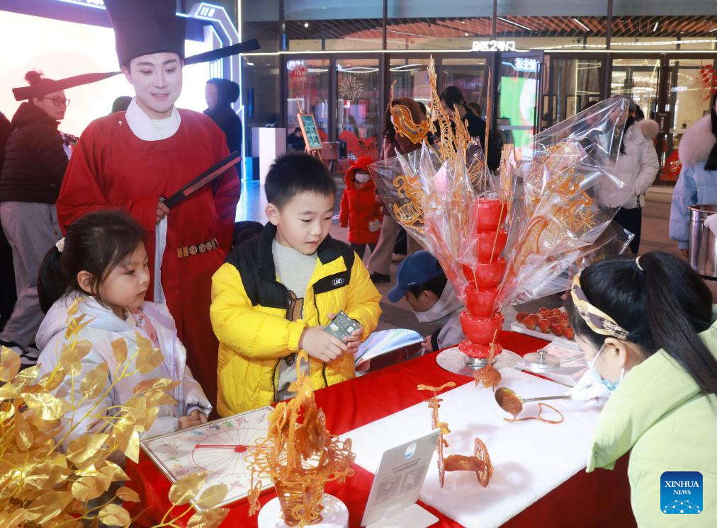 Children try their hands with syrup art at an event themed on the "Hubei New Spring International Consumption Season" in Wuhan, central China's Hubei Province, Feb. 5, 2026. The "Hubei New Spring International Consumption Season" kicked off here on Thursday, attempting to create diverse consumption scenarios for the upcoming Spring Festival. (Photo by Zhao Jun/Xinhua)
