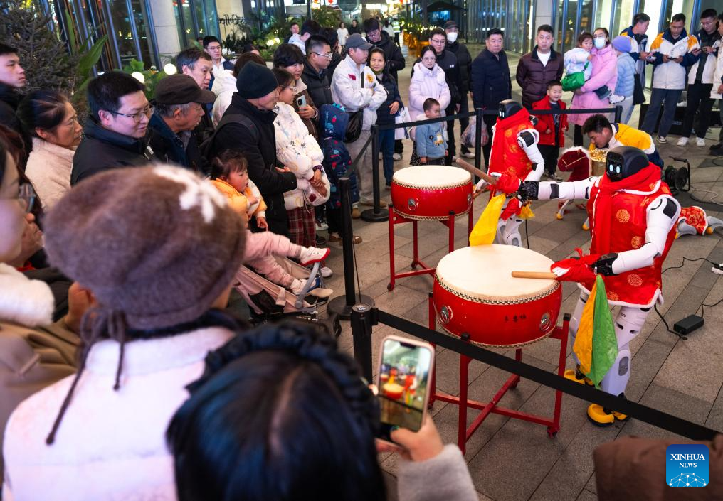 People watch humanoid robot performance at an event themed on the "Hubei New Spring International Consumption Season" in Wuhan, central China's Hubei Province, Feb. 5, 2026. The "Hubei New Spring International Consumption Season" kicked off here on Thursday, attempting to create diverse consumption scenarios for the upcoming Spring Festival. (Xinhua/Xiao Yijiu)