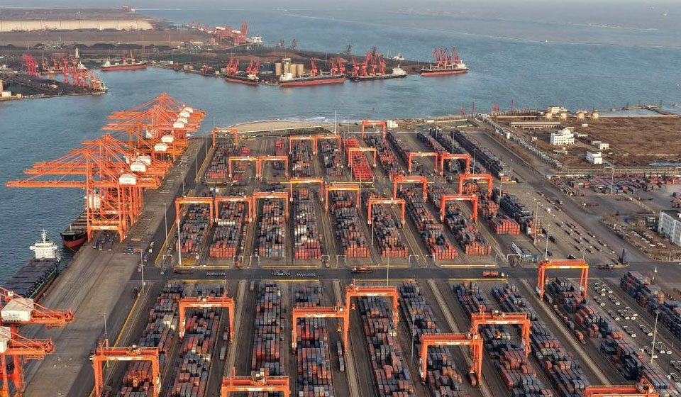 An aerial drone photo taken on Feb. 5, 2026 shows a container dock of Tangshan Port in Tangshan, north China's Hebei Province. The foreign trade cargo throughput in Tangshan Port reached 381.56 million tonnes in 2025, up 2.59 percent year on year. (Xinhua/Yang Shiyao)