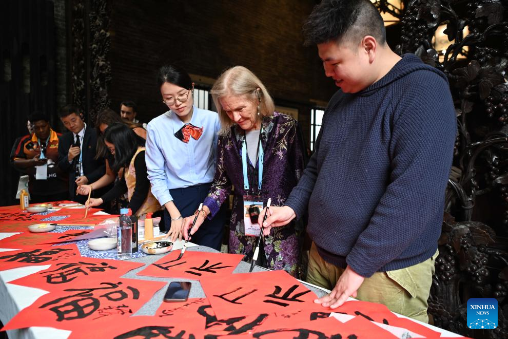 Delegates attending the APEC Senior Officials' Meeting and related sessions experience Chinese calligraphy at Chen Clan Ancestral Hall scenic area in Guangzhou, south China's Guangdong Province, Feb. 6, 2026. China, the host of the 33rd APEC Economic Leaders' Meeting in November, holds the first APEC Senior Officials' Meeting and related sessions in Guangzhou from Feb. 1 to 10. (Xinhua/Deng Hua)