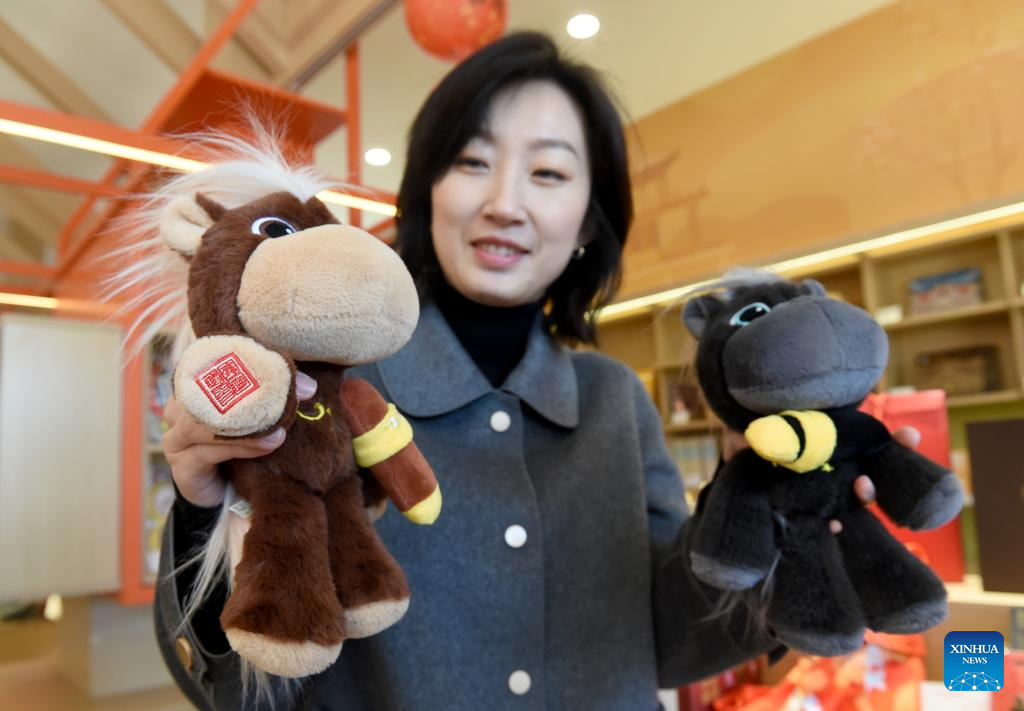 A staff member displays newly launched horse-head plush toys during a Spring Festival garden party at the Old Summer Palace (Yuanmingyuan) in Beijing, capital of China, Feb. 7, 2026. The four-day Spring Festival garden party opened here on Saturday. (Xinhua/Luo Xiaoguang)