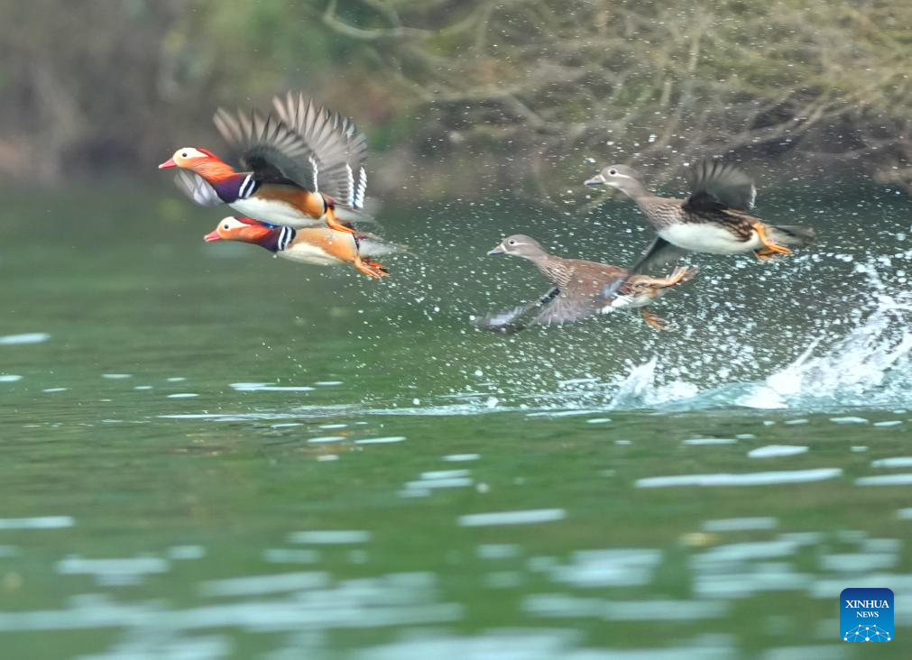 Mandarin ducks have fun in a river in Yanglin Town, Hengdong county, Hengyang city of central China's Hunan province, Feb. 4, 2026. (Photo by Cao Zhengping/Xinhua)