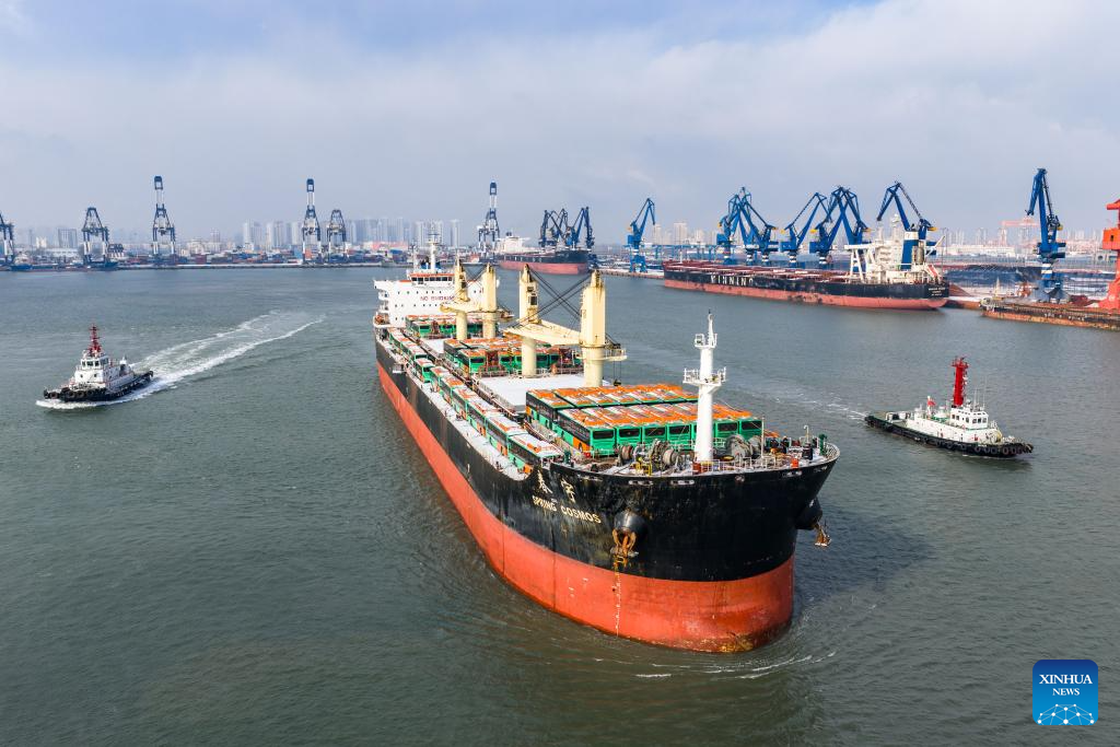 An aerial drone photo shows a ship loaded with natural gas-powered buses for export to Mexico leaving Yantai Port in Yantai, east China's Shandong Province, Feb. 7, 2026.