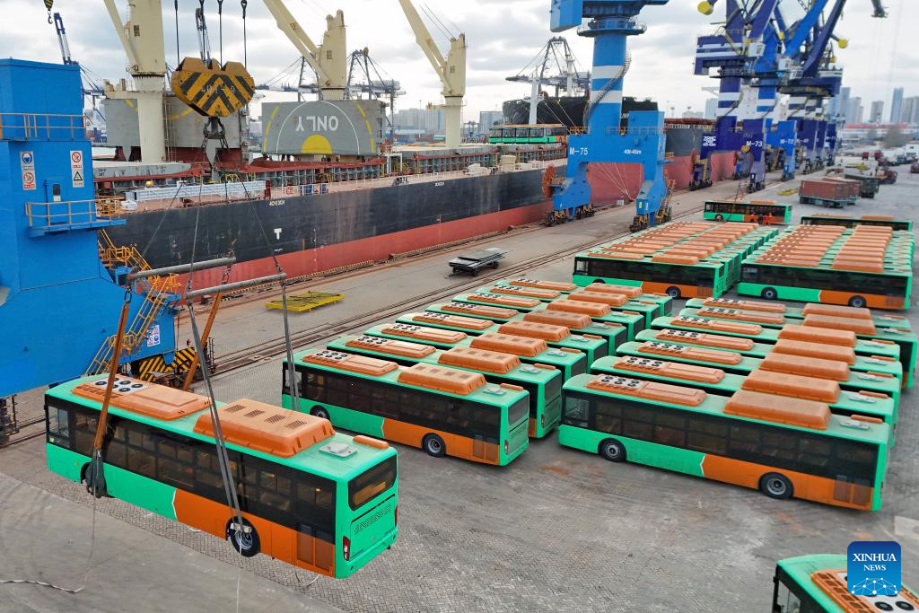 An aerial drone photo shows natural gas-powered buses for export to Mexico being loaded to a ship at Yantai Port in Yantai, east China's Shandong Province, Feb. 6, 2026.