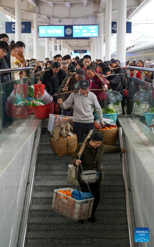 Villagers carrying goods for sale prepare to leave the Tongren Railway Station in Tongren City, southwest China's Guizhou Province, Feb. 12, 2026.