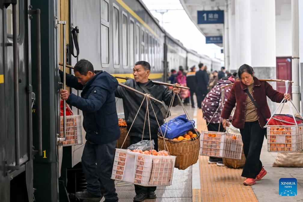 Farmers carrying goods for sale board the train No. 7272 bound for Tongren City, southwest China's Guizhou Province, Feb. 12, 2026.