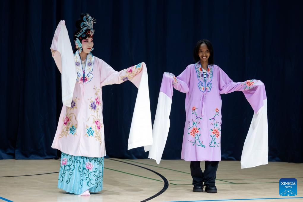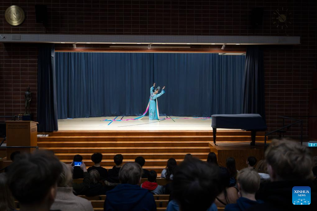 A Chinese traditional opera performance is staged during a "Happy Chinese New Year" campus event at Kulosaari Secondary School in Helsinki, Finland, Feb. 13, 2026. A lively "Happy Chinese New Year" campus event was held at Kulosaari Secondary School in Helsinki on Friday. (Photo by Matti Matikainen/Xinhua)