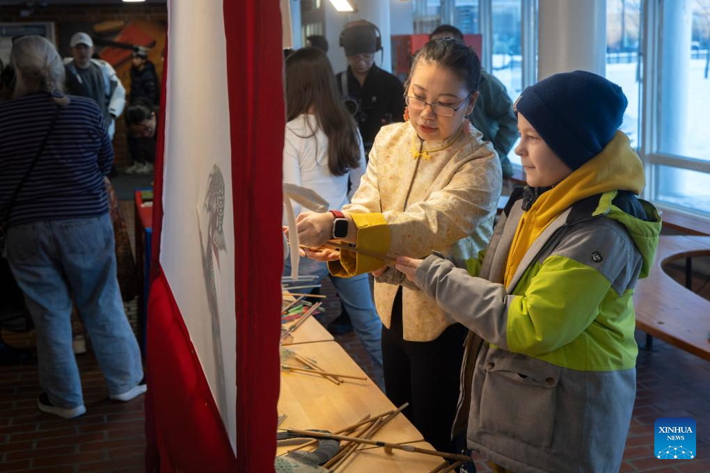 A student (R) , under the guidance of a professional instructor, tries out an intangible cultural heritage shadow puppetry during a "Happy Chinese New Year" campus event at Kulosaari Secondary School in Helsinki, Finland, Feb. 13, 2026. A lively "Happy Chinese New Year" campus event was held at Kulosaari Secondary School in Helsinki on Friday. (Photo by Matti Matikainen/Xinhua)