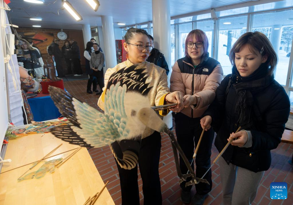 Students try out an intangible cultural heritage shadow puppetry during a "Happy Chinese New Year" campus event at Kulosaari Secondary School in Helsinki, Finland, Feb. 13, 2026. A lively "Happy Chinese New Year" campus event was held at Kulosaari Secondary School in Helsinki on Friday. (Photo by Matti Matikainen/Xinhua)