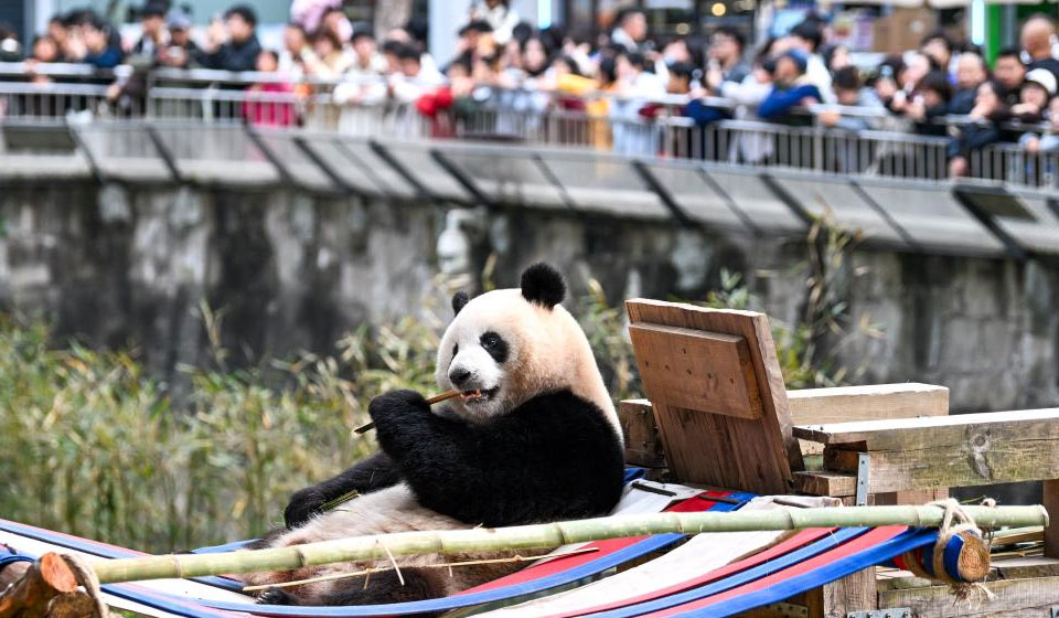 A giant panda enjoys bamboo at Chongqing Zoo in southwest China's Chongqing Municipality, Feb. 24, 2026. Giant pandas attracted numerous tourists at Chongqing Zoo. (Xinhua/Tang Yi)
