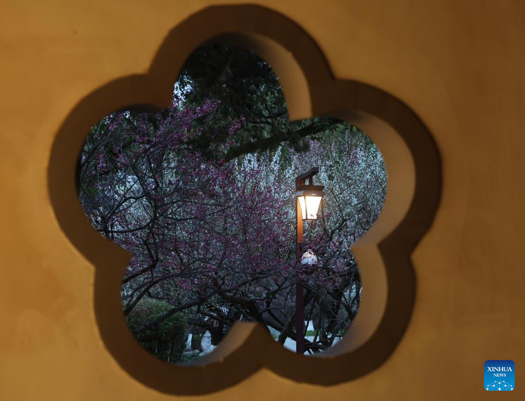 Tourists enjoy plum blossoms at Chaoshan scenic area in Hangzhou, east China's Zhejiang Province, Feb. 23, 2026. The scenic area kicked off on Monday a special night tour event among plum blossom trees illuminated by light. (Xinhua/Xu Yu)