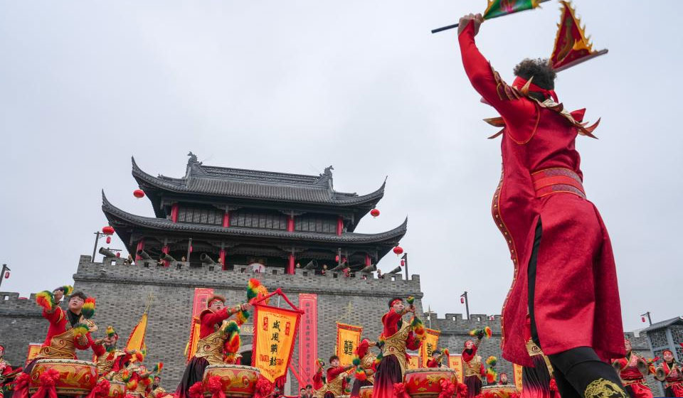 A performer plays the drum during a temple fair in Wuxi, east China's Jiangsu Province, Feb. 25, 2026. The temple fair, featuring folk parades, intangible cultural heritage performances, and cultural markets, kicked off on Wednesday. (Xinhua/Li Bo)