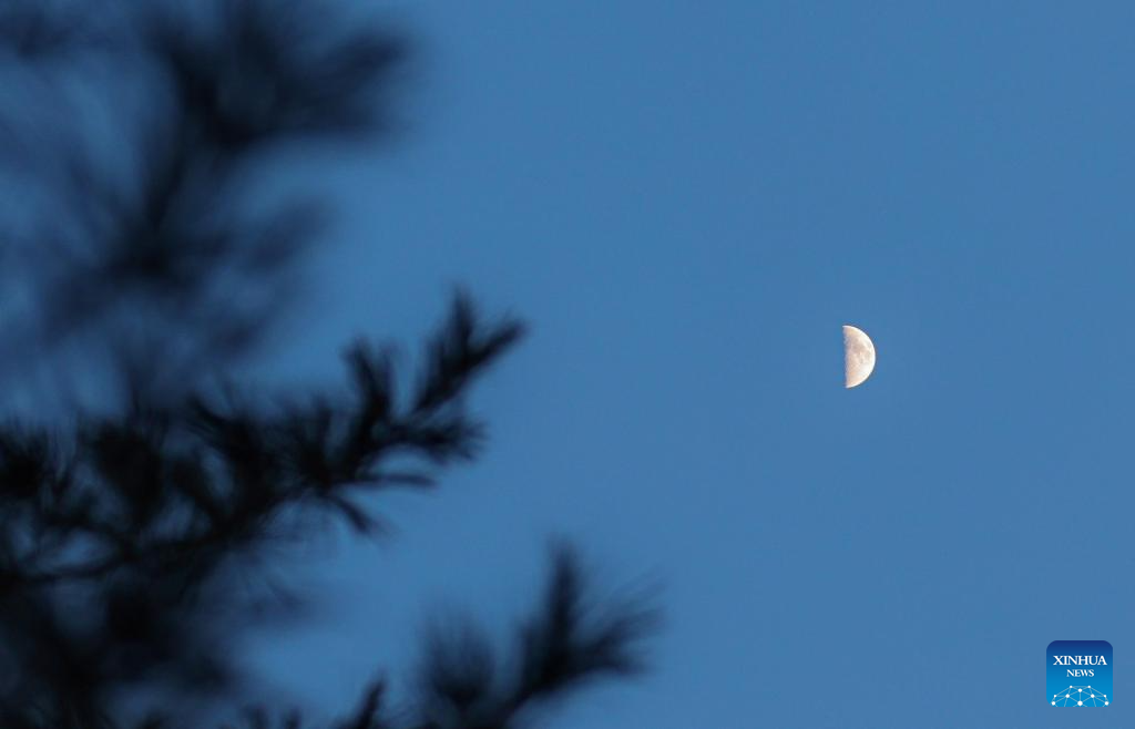 This photo taken on Feb. 24, 2026 shows the moon over Yimei District of Yichun, northeast China's Heilongjiang Province. The largest first quarter moon of the year appeared in the sky on Tuesday. The moon was near its perigee in orbit, approximately 370,000 kilometers from the Earth. (Photo by Li Jiaxing/Xinhua)
