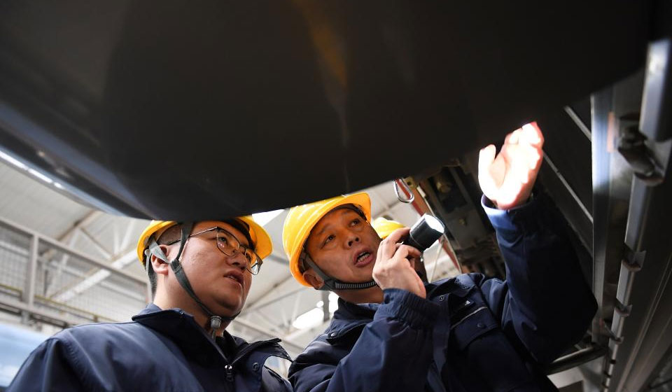 Dong Hongtao (R) and a colleague examine and maintain a bullet train at a maintenance depot of China Railway Xi'an Group Co., Ltd. in Xi'an, northwest China's Shaanxi Province, Jan. 14, 2026.