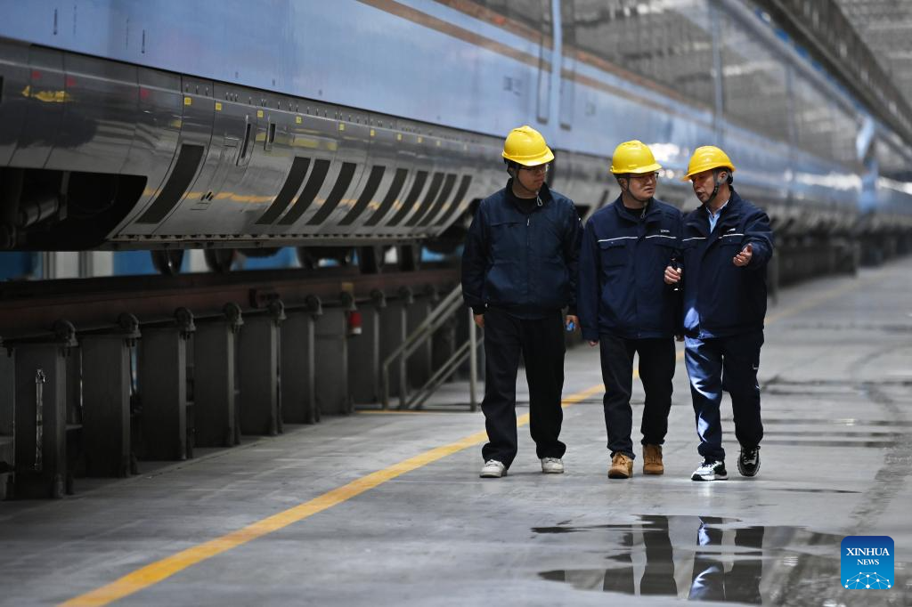 Dong Hongtao (R) and colleagues examine and maintain a bullet train at a maintenance depot of China Railway Xi'an Group Co., Ltd. in Xi'an, northwest China's Shaanxi Province, Jan. 14, 2026. (Xinhua/Li Yibo)