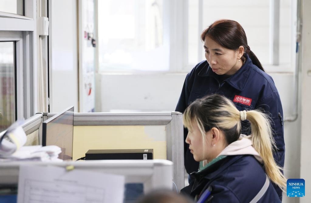 Guo Hongjing (R) talks with her colleague at Tianjin Lizhong Wheel Co., Ltd. in north China's Tianjin, Feb. 25, 2026. (Xinhua/Li Ran)