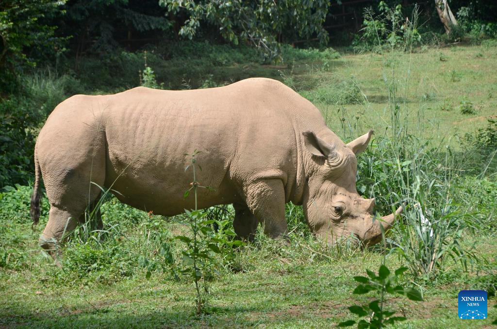 This photo taken on March 3, 2026 shows a white rhino grazing at the Uganda Wildlife Conservation Education Centre in Entebbe, Uganda.