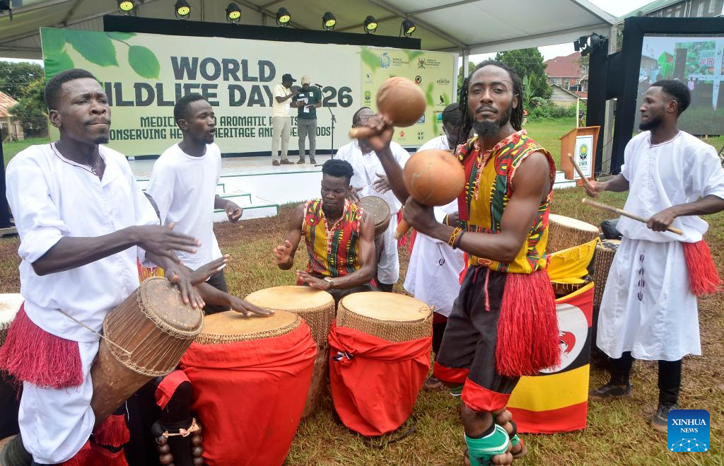 Artists perform during an event to mark the World Wildlife Day in Entebbe, Uganda, on March 3, 2026.