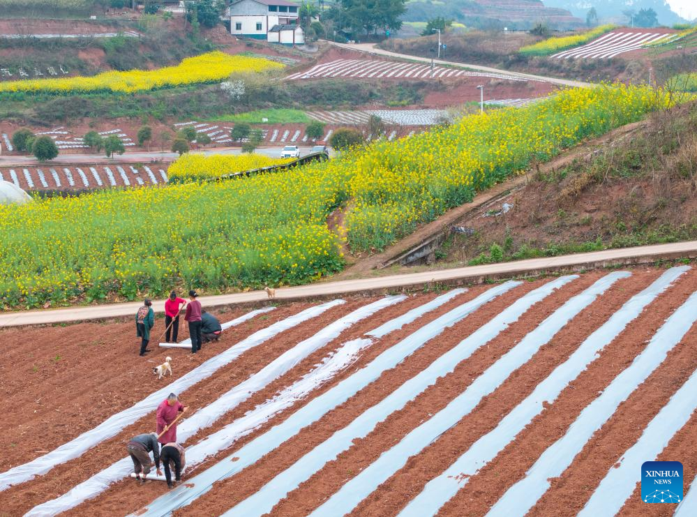 An aerial drone photo taken on March 6, 2026 shows farmers mulching at a field in Tiangongmiao Village, Lede Town, Rongxian County of southwest China's Sichuan Province. (Xinhua/Jiang Hongjing)