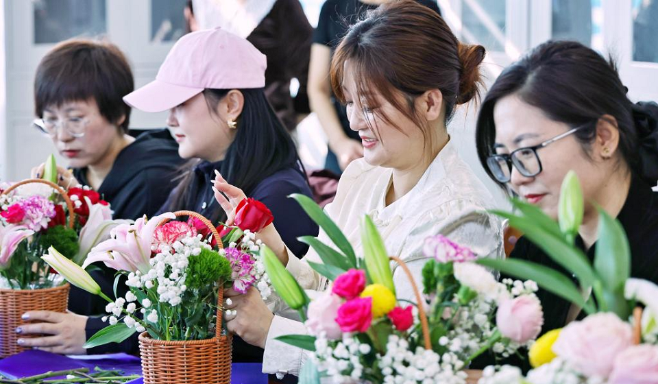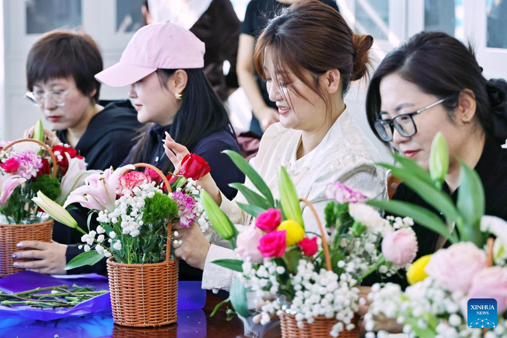 Women learn flower arranging at an event celebrating International Women's Day in Mengzi City, southwest China's Yunnan Province, March 5, 2026. Various events were held across China recently to mark International Women's Day. (Photo by Xue Yingying/Xinhua)