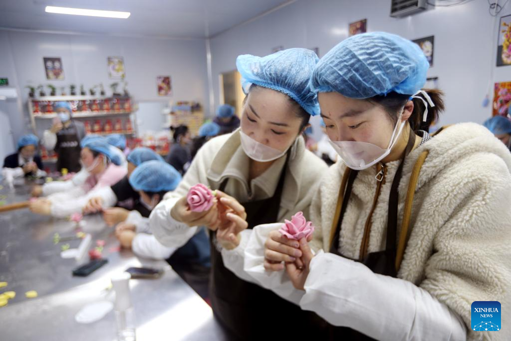 Women make dough sculpture at an event celebrating International Women's Day in Lianyungang, east China's Jiangsu Province, March 6, 2026. Various events were held across China recently to mark International Women's Day. (Photo by Wang Chun/Xinhua)